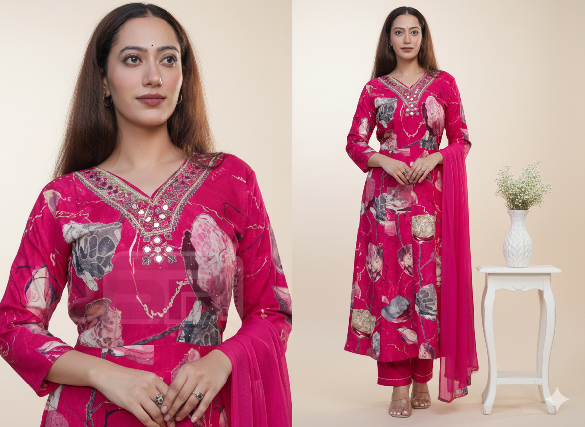 Set Includes: Designer Kurti, Matching Bottoms, and a Coordinating Dupatta.
