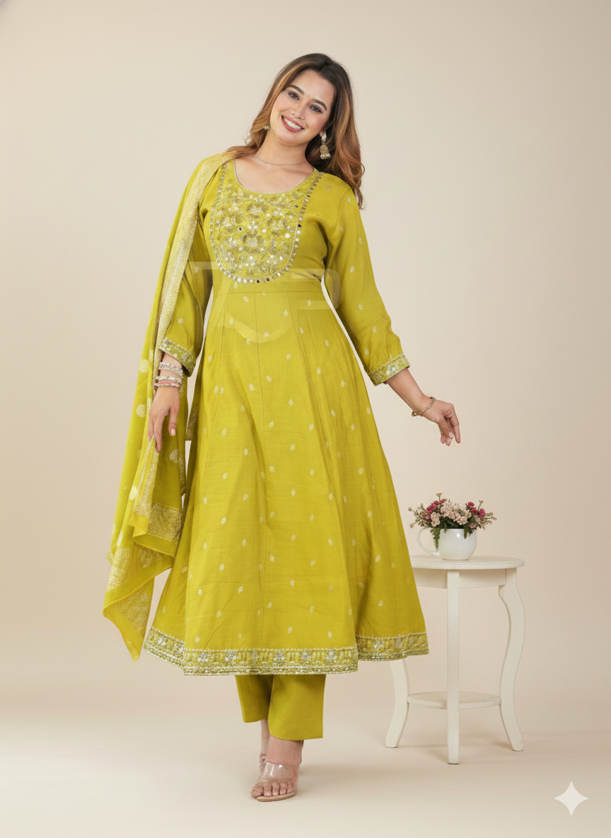Set Includes: Designer Kurti, Matching Bottoms, and a Coordinating Dupatta.