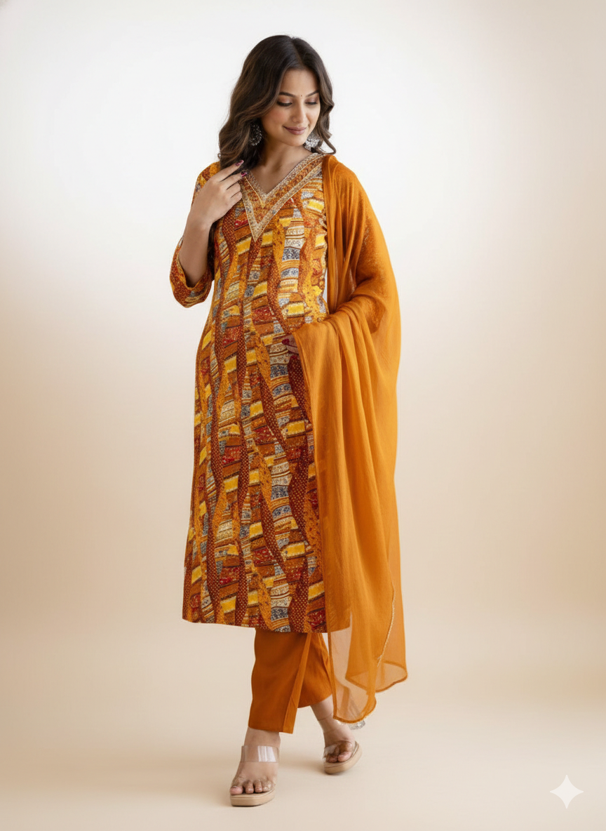 Set Includes: Designer Kurti, Matching Bottoms, and a Coordinating Dupatta.