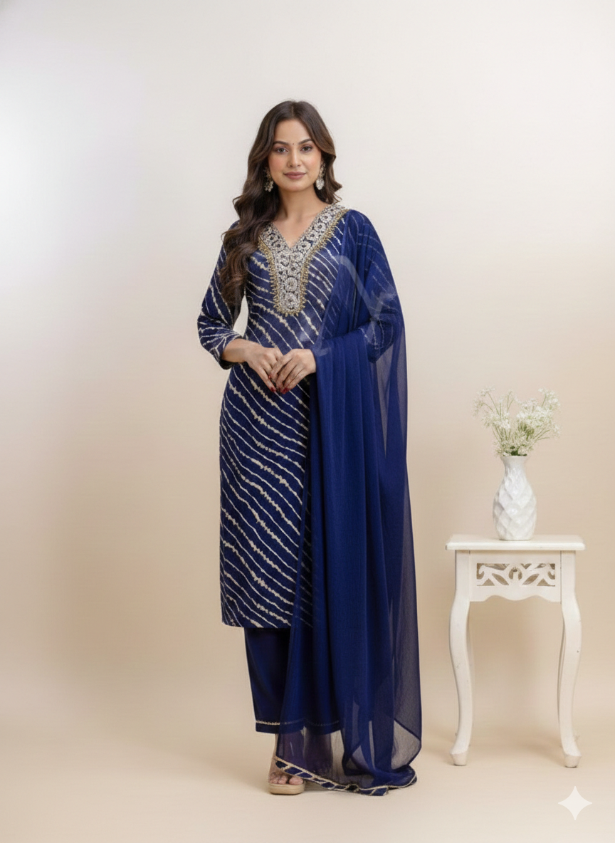 Set Includes: Designer Kurti, Matching Bottoms, and a Coordinating Dupatta.