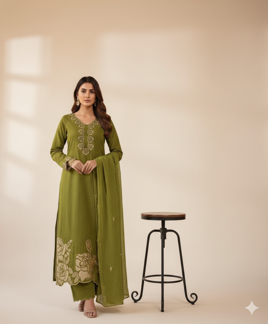 Set Includes: Designer Kurti, Matching Bottoms, and a Coordinating Dupatta.